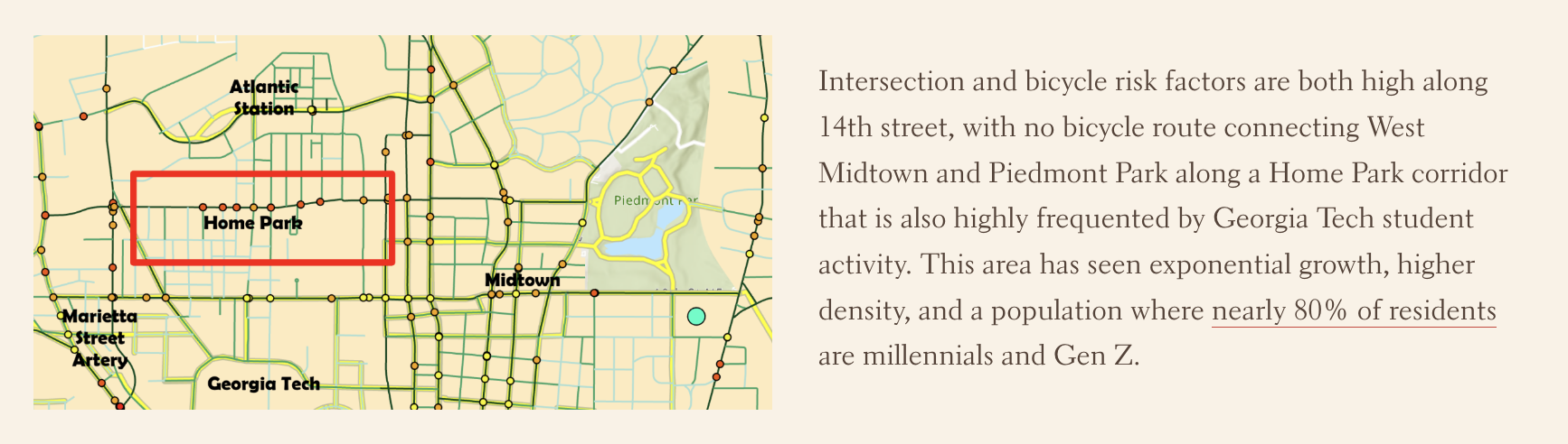 Conducted a detailed analysis of bicycle safety in selected risk zones within Midtown and Downtown Atlanta.