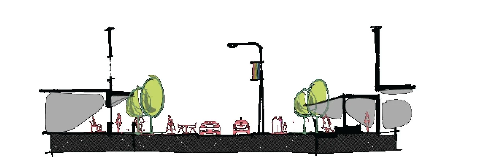 Developed streetscape plans using Streetmix, incorporating wider pedestrian walkways, street vendor space, parklets, urban furniture, greater micromobility accessibility, and green space for safety and walkability.